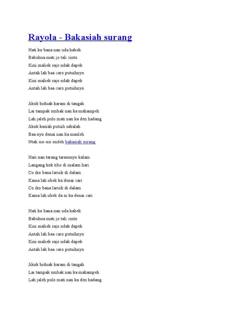 Terjemahan Lirik Lagu Rayola - Padiah Ditusuak Cinto. Rayola - Rilakan denai Dapatkan link Facebook Twitter Pinterest Email Aplikasi Lainnya April 06 2016 Lirik Lagu Maafkanlah diri denai da sayang Indak talok manulak kandak Diri denai iyo di jodohkan Jo pilihan rang tuo denai Raso ramuak jantuang di dalam. Lagu Minang Terbaru 2020 Rayola Sakik Taubek Hilang BagantiArtist.