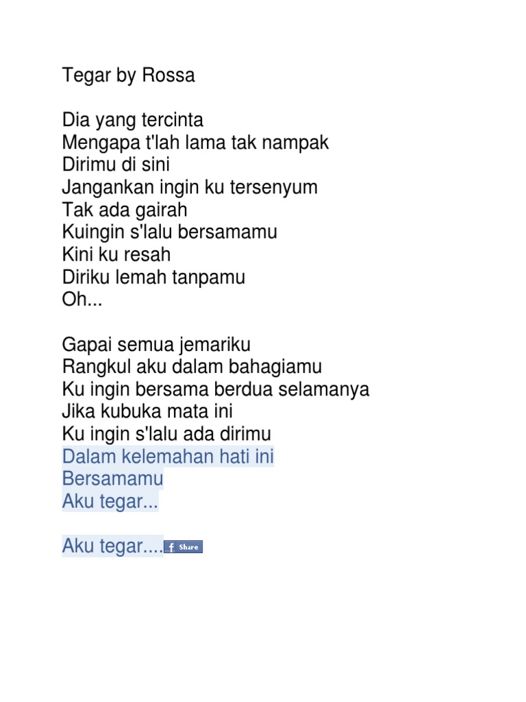 Lirik Lagu Dan Chord Kunci Gitar Tegar Rindu Ibu Tribun Video Jumat 29 november 2019 19 06. Chord kunci gitar dan lirik lagu Rindu Ibu - Tegar lagu-lagu untuk memeringati hari ibu Minggu 22 Desember 2019 Jelang Konser Tegar 20 Rossa Ungkap Kisah Sedihnya Nyanyikan Lagu Tegar Ciptaan Melly Goeslaw Jelang konser bertajuk Tegar 20 Rossa. Cintailah aku intro.