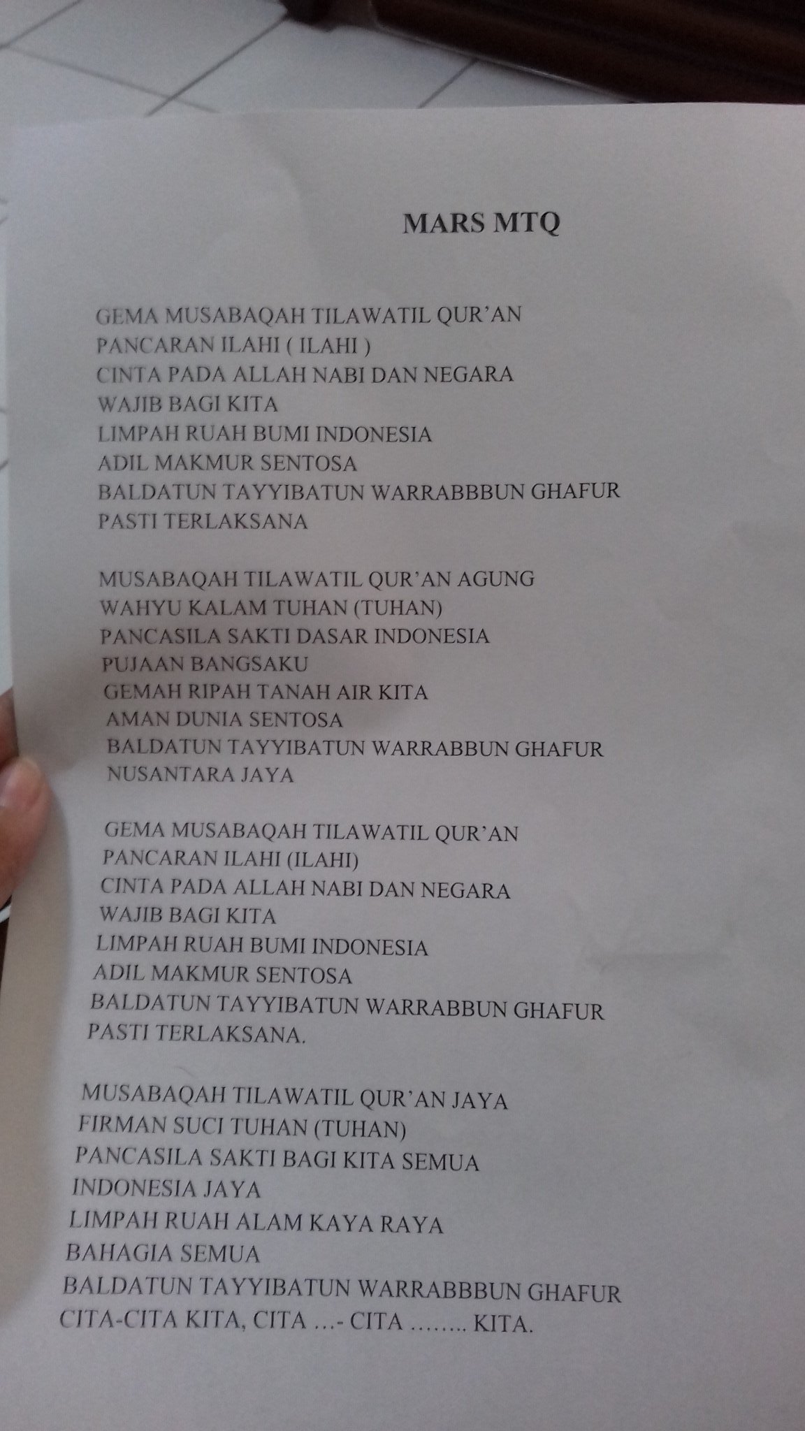 Gema musabaqoh tilawatil quran pancaran ilahi ilahi cinta pada allah nabi dan negara wajib bagi kita. Lagu Mars MTQ Ciptaan Agus Sunaryo Gema Musabaqah Tilawatil QuranPancaran IlahiCinta pada Allah Nabi dan NegaraWajib bagi kitaLimpah ruah bumi IndonesiaAdil makmur sentosaBaldatun thayyibatun warabbun ghafurPasti terlaksanaMusabaqah Tilawatil Quran AgungWahyu kalam TuhanPancasila sakti dasar IndonesiaPujaan bangsakuGemah ripah tanah air kitaAman damai sentosaBaldatun. Hymne mtq nasional mp3.