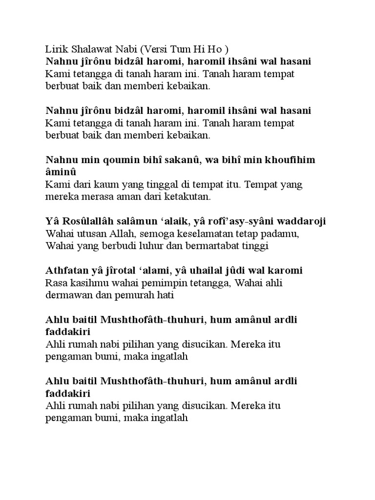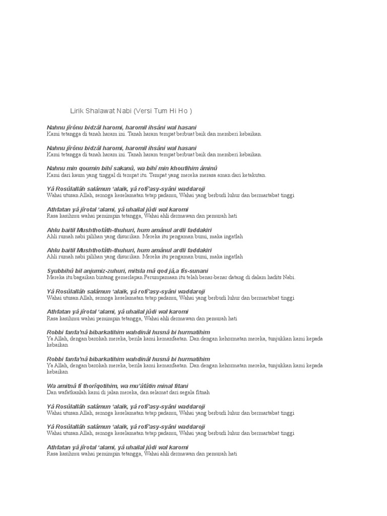 Sholawat Nariyah Versi Terbaru Bikin Bapermp3 download. Kumpulan Lirik Syair Lagu India Tum Hi Ho versi Sholawat Ya Rosulallah Tum Hi Ho. Lirik Shalawat Nabi Ya RosulallahVersi Tum Hi Ho Nahnu jîrônu bidzâl haromi haromil ihsâni wal hasani Nahnu jîrônu bidzâl haromi haromil ihsâni wal hasani Nahnu min qoumin bihî sakanû wa bihî min khoufihim âminû Yâ Rosûlallâh salâmun alaik yâ rofîasy-syâni waddaroji Athfatan yâ.