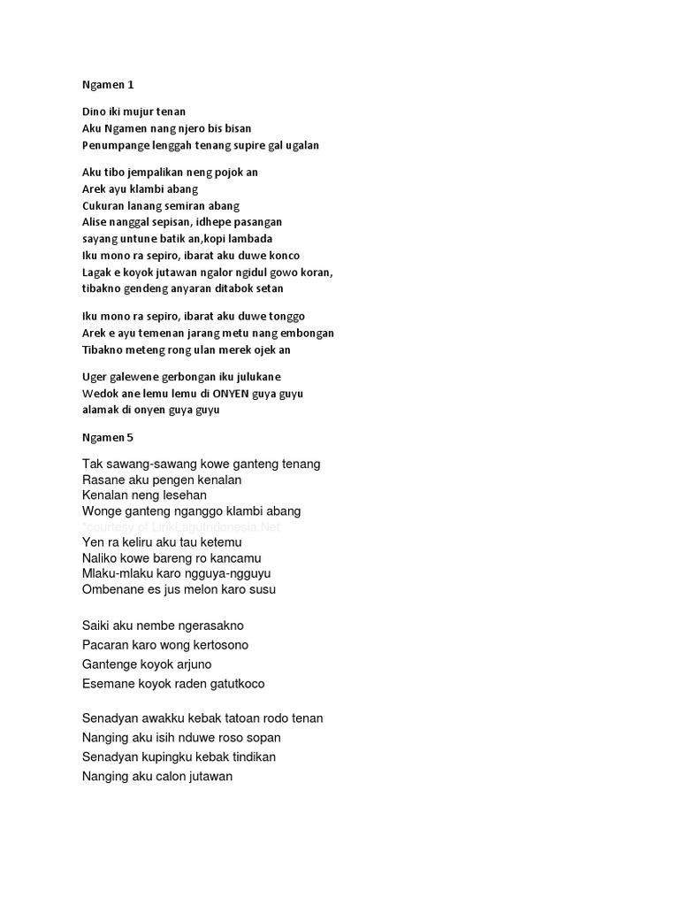Bisa dikatakan mbak Eny Setyasih beserta group Sagita-nya adalah pionir lagu-lagu Koplo di. Dino iki mujur tenan. Selamat membaca serta menyanyikan lirik lagu Ngamen 1 yang dibawakan oleh Shepin Misa.