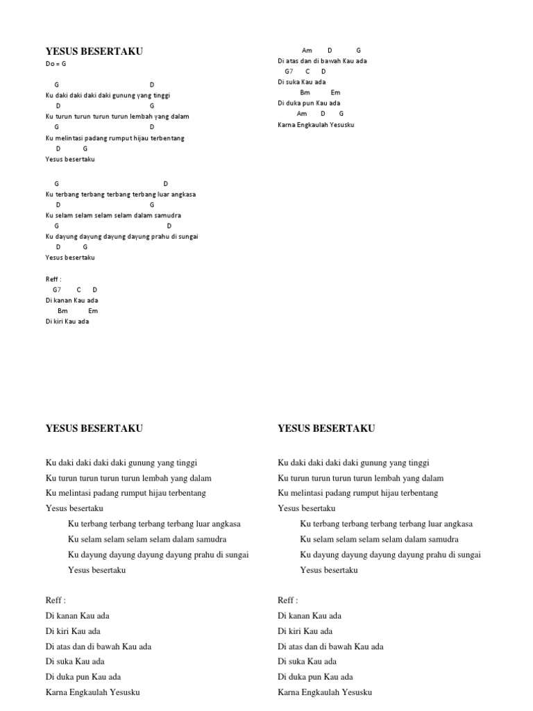 Kuterbang terbang terbang terbang luar angkasa Kuselam selam selam selam dalam samudra Kudayung dayung dayung dayung perahu di sungai Yesus besertaku. Untuk konten lain di situs ini yang masih berhubungan berikut daftar tema-tema yang berkaitan. Sumber terlengkap lirik lagu rohani Kristen lirik lagu rohani lirik lagu Kristen kidung pujian himne nyanyian praise and worship.
