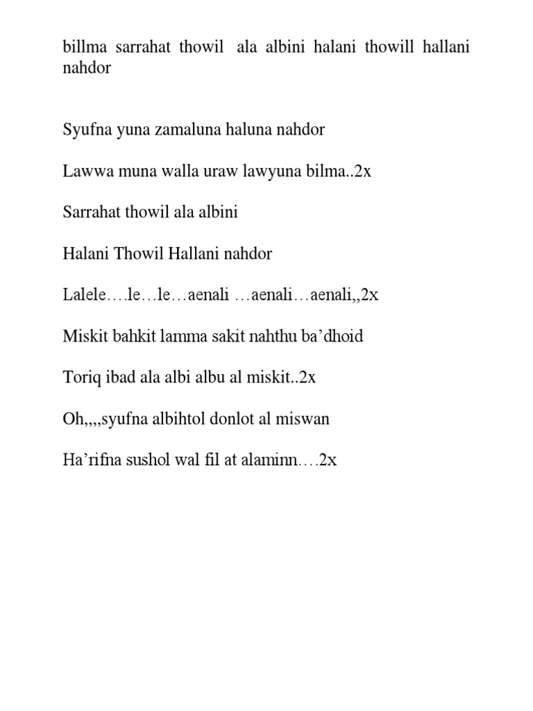 LIRIK LAGU MARAWIS SUFNA YUNA. Kak tolong dong yg tau lirik artinya sufna 22 Maret 2017 1806 FATA mengatakan. LIRIK LAGU MARAWIS - SYUFNA YUNA Syufna yuna zamaluna haluna nahdor Lawwa muna walla uraw lawyuna bilma2x Sarrahat thowil ala albini Halani Thowil.