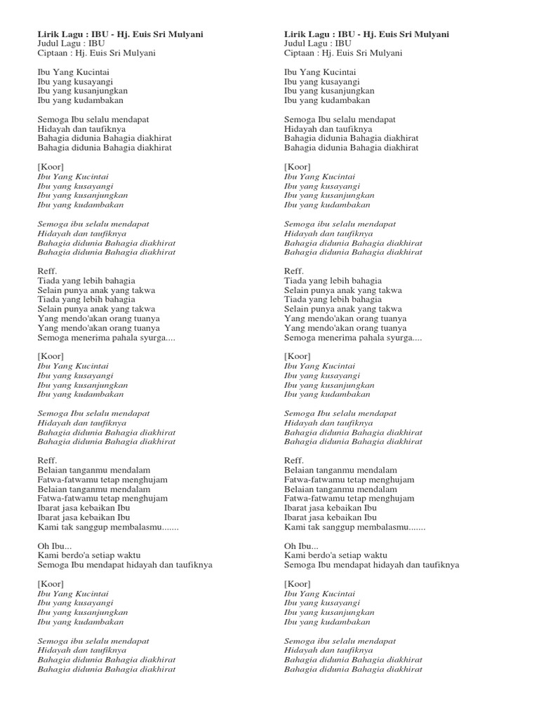 Bagaikan laut yang tak bertepian. Di waktu ku masih kecil gembira dan senang Tiada duka kukenal tak kunjung mengerang Di sore hari nan sepiibuku bertelut Sujud berdoa ku dengar namaku disebut Di doa ibuku namaku disebut Di doa ibuku ku dengar ada namaku disebut Sering ini kukenang di masa yang berat Di kala hidup mendesak dan nyaris ku sesat Melintas gambar ibuku. Air mata mengalir hatiku pilu.