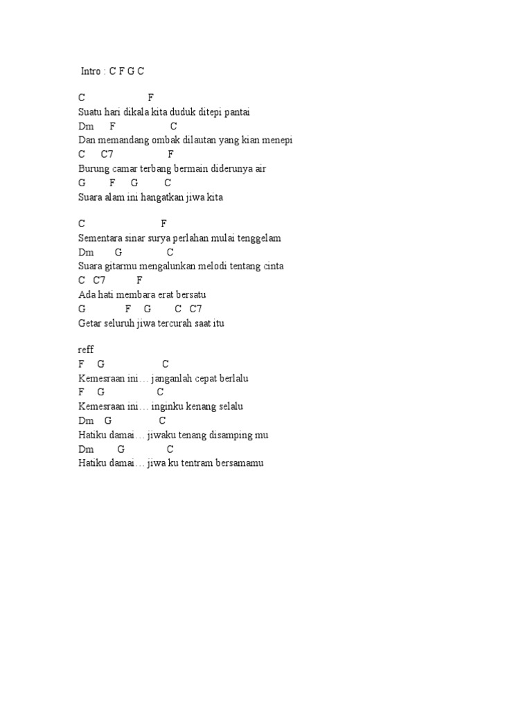 Janganlah cepat berlalu Kemesraan ini Inginku kenang selalu Hatiku damai Jiwaku tentram di samping mu Hatiku damai Jiwa ku tentram Bersamamu end Lirik Lagu Dilengkapi Terjemahan Korban Janji - Guyon Wathon Lirik Lagu Dilengkapi Terjemahan Secret. CHORD Lagu Kemesraan - Iwan Fals. Janganlah cepat berlalu.