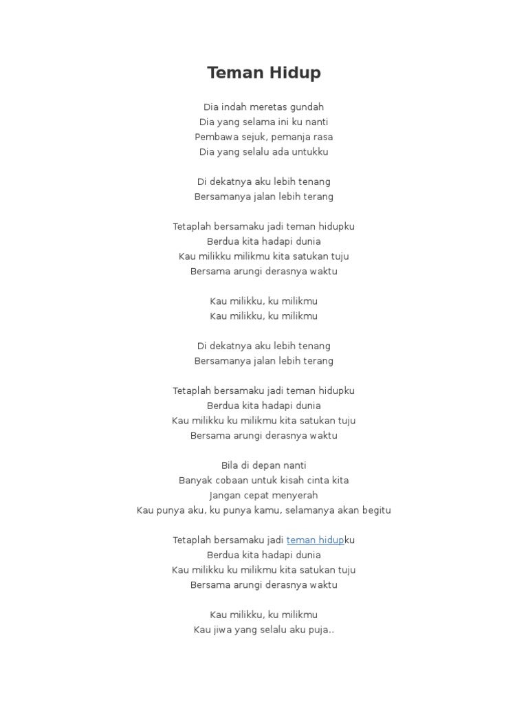 Lirik lagu tetaplah bersamaku jadi teman hidupku. Tetaplah bersamaku jadi teman hidupku Berdua kita hadapi dunia Kau milikku milikmu kita satukan tuju Bersama arungi derasnya waktu. Tetaplah Bersamaku jadi Teman Hidupku Chord kunci gitar dan lirik lagu Teman Hidup - Tulus. Bersama arungi derasnya waktu.