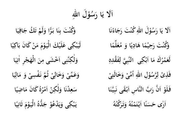Hendaklah menangis sekarang bagi orang yang ingin menangis. الا يا رســـول الله كنت رجاءنا. كنت رحــيما هـــاديا ومـعلــما.