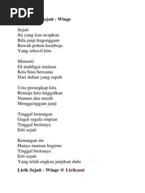 Lirik Lagu Sejati - Wings Sejati Itu yang kau ucapkan Bila janji kugenggam Bawah pohon kemboja Yang sekecil kita Menanti Di mahligai mainan Kita bina bersama Dari. Download MP3 - NOTE - you will be redirected to a third party converter site you are not. Lirik Lagu Wings Sejati dari album Teori Domino Sejati Itu yang kau ucapkan Bila janji ku genggam Bawah pohon kemboja Yang sekecil kita Menanti Di mahligai.