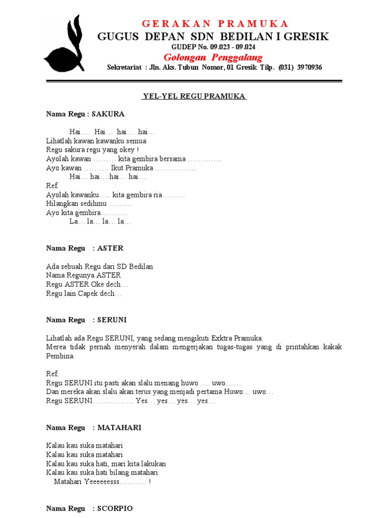 Lirik yel yel pramuka regu sakura. Karena hanya regu sakura yang paling Keren eaa eaaa. Naik Kereta Api Kamilah regu gajah yes yes yes Kami pantang menyerah. Berikut adalah daftar lirik lagu Yel-Yel Pramuka kalian juga dapat mendownload file lirik.